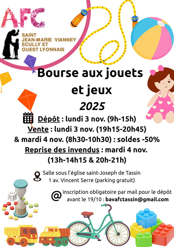 Voici les informations pour la prochaine bourse aux jouets, jeux et livres qui aura lieu le lundi 3 et le mardi 4 novembre 2025, dans la salle sous l’église saint-Joseph de Tassin.