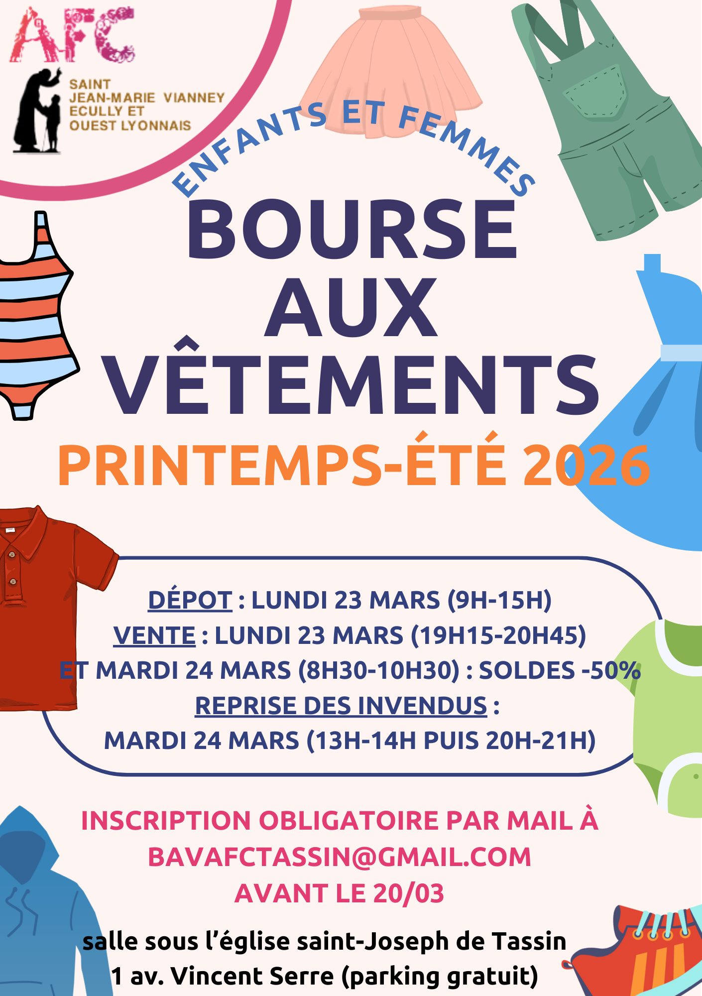 BOURSE AUX VÊTEMENTS PRINTEMPS-ETE 2026. LUNDI 23 MARS ET MARDI 24 MARS A TASSIN.