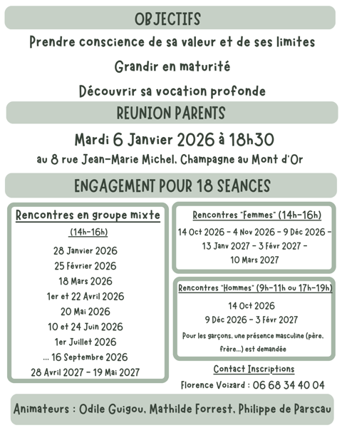 En équipe de 6 à 10, les parents se rencontrent une fois par mois pendant l’année scolaire. Les sujets sont variés : les rivalités frères-sœurs, l’articulation vie familiale-vie professionnelle, les écrans, les peurs de nos enfants, la confiance en soi, l’autonomie… Les participants y enrichissent leurs expériences quotidiennes d’éducation et développent leurs compétences à rechercher le Bien pour chaque enfant.
