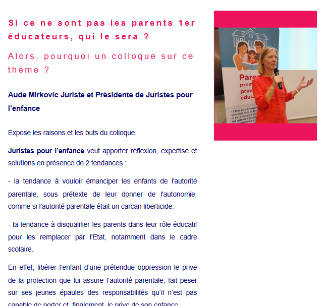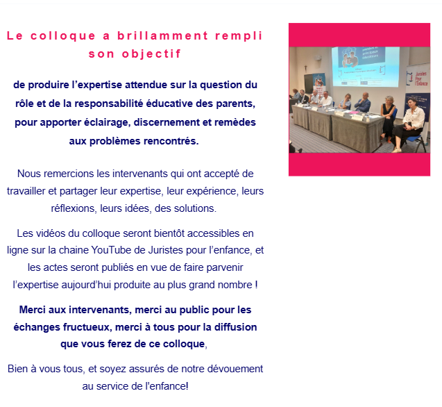 Prochainement : les vidéos seront mises en ligne en accès libre sur la chaine YouTube de Juristes pour l’enfance. Juristes pour l’Enfance – YouTube