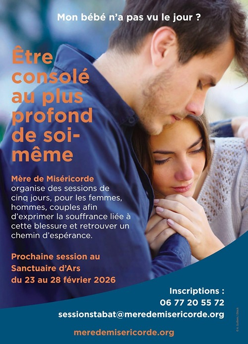| Être consolé au plus profond de soi-même. Mère de Miséricorde organise des sessions de cinq jours, pour les femmes, hommes, couples afin d’exprimer la souffrance liée à cette blessure et retrouver un chemin d’espérance. Prochaine session au Sanctuaire d’Ars du lundi 23 au samedi 28 février 2026 Inscriptions : 06 77 20 55 72 sessionstabat@meredemisericorde.org |