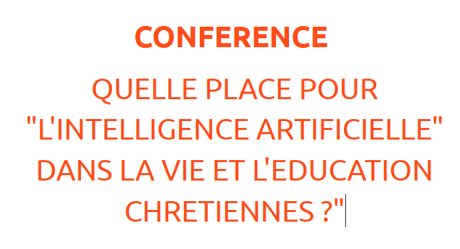 CONFERENCE : QUELLE PLACE POUR « L’INTELLIGENCE ARTIFICIELLE » DANS LA VIE ET L’EDUCATION CHRETIENNES ? ». MARDI 17 MARS – MAISON FAMILYA DE LYON. Publié le 30 janvier 2026 par Fédération des AFC 69 Conférence de Gilles POYAUD (physicien et diplômé en bioéthique médicale)mardi 17 mars 2026 20h à Familya LYON salle de conférence 52 cours Charlemagne 69002 LYON (participation (5 euros .. pas en CB) aux frais souhaitée)