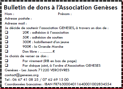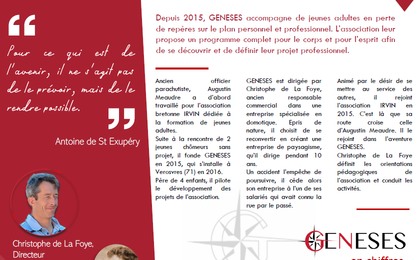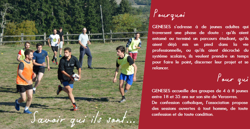 Voici la présentation de l’association GENESES, basée en Saône-et-Loire (71), entre Mâcon et Charolles. L’association propose de remettre «à flot» de jeunes étudiants ou de jeunes actifs en leur proposant une période de pause et de réflexion personnelle et professionnelle pour mieux repartir : Un jeune qui aurait échoué dans ses études, un autre qui aurait pris conscience qu’il s’est peut-être trompé de voie professionnelle…Nous connaissons tous quelqu’un qui a pu traverser cette période.