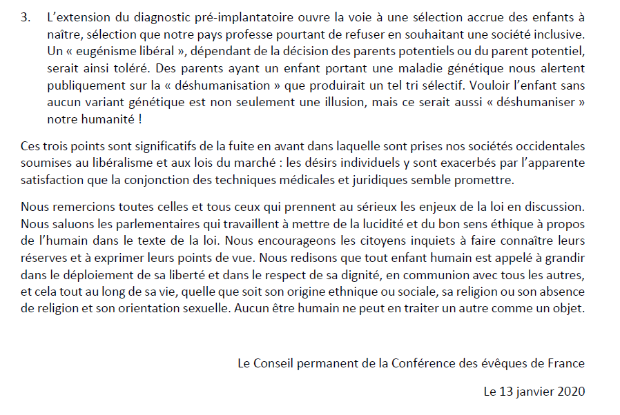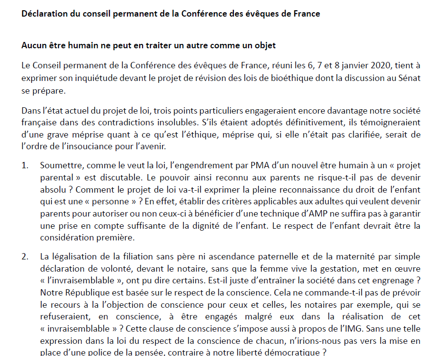 Déclaration du 13 janvier 20 du Conseil permanent de la Conférence des Evêques de France sur la bioéthique : « Aucun être humain ne peut en traiter un autre comme un objet » Publié le 14 janvier 2020 par Fédération des AFC 69